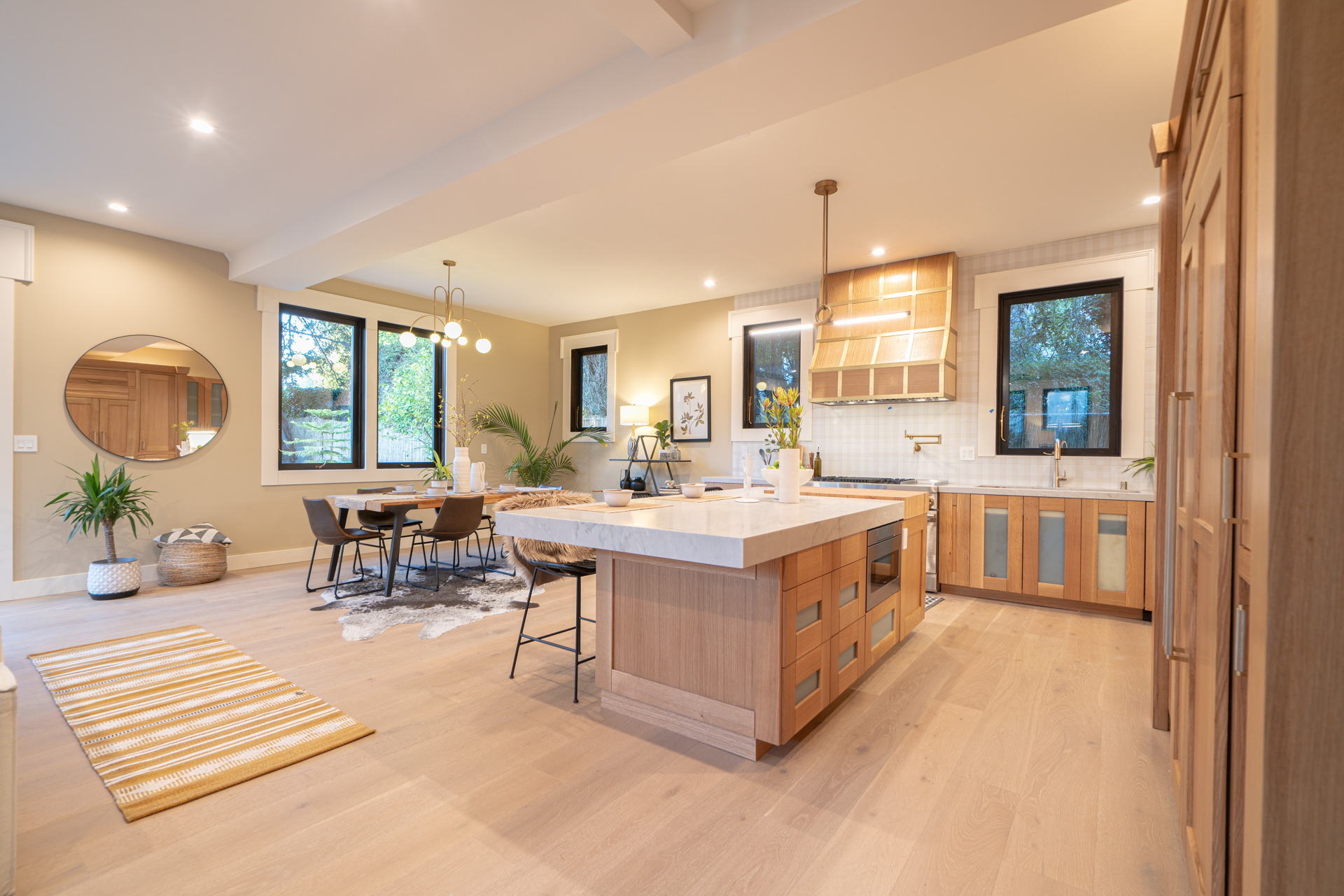 Powered large center island with mitered edge stone counter, custom built-in butcherblock station, and under cabinet storage
