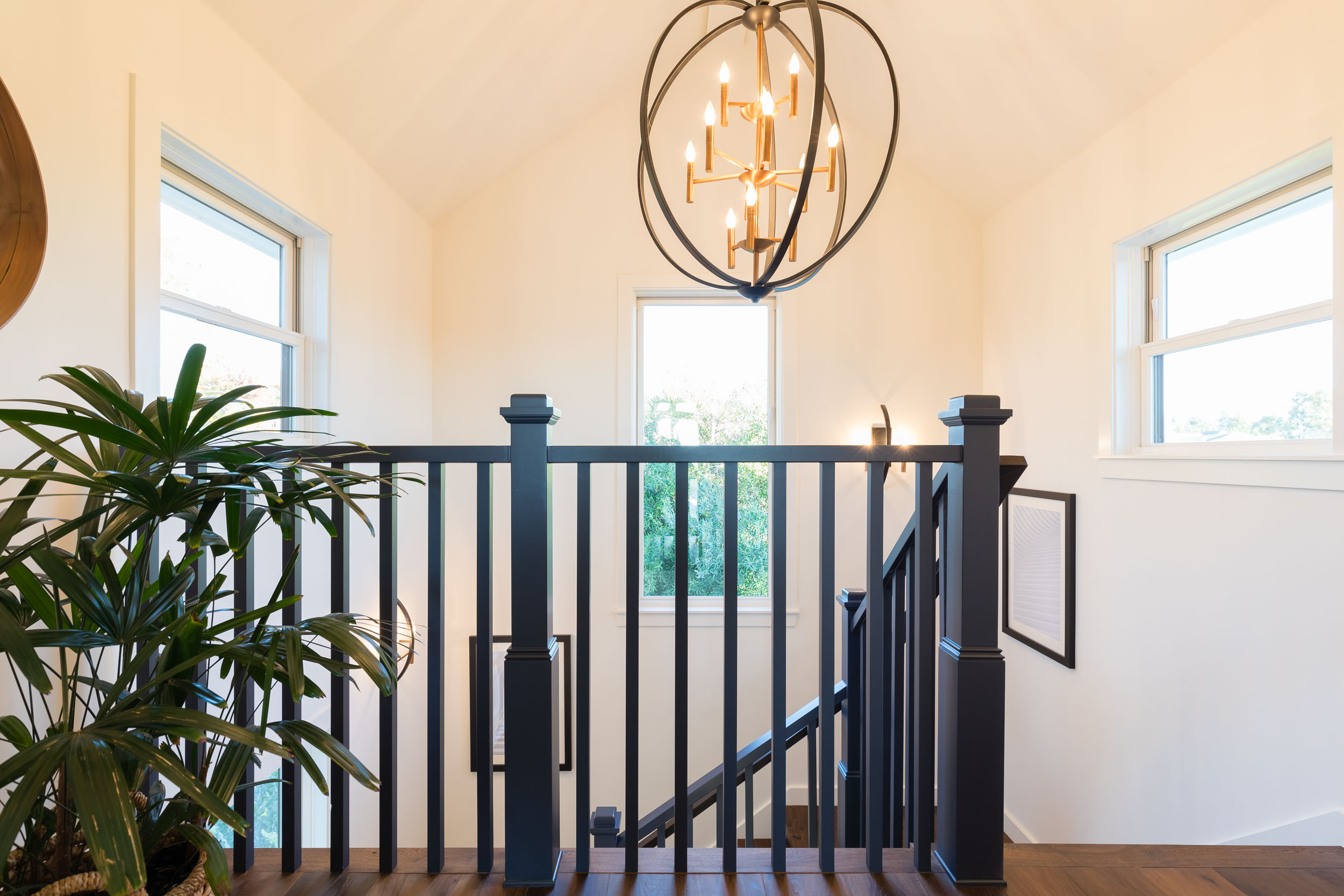 Eye-catching in its design, the exterior staircase leads up to the covered porch and main entry. You immediately enter into a great room plan living space, which seamlessly connects to the dining room and kitchen for entertaining on any scale. Complete with integrated speakers, a large central island for gathering, and a cozy hearth to ground the space, you’ll enjoy great room living for years to come. A full bath and bedroom sit off the hall. From here, you can travel up or down via the dramatic central staircase, illuminated by a grand scale designer chandelier.