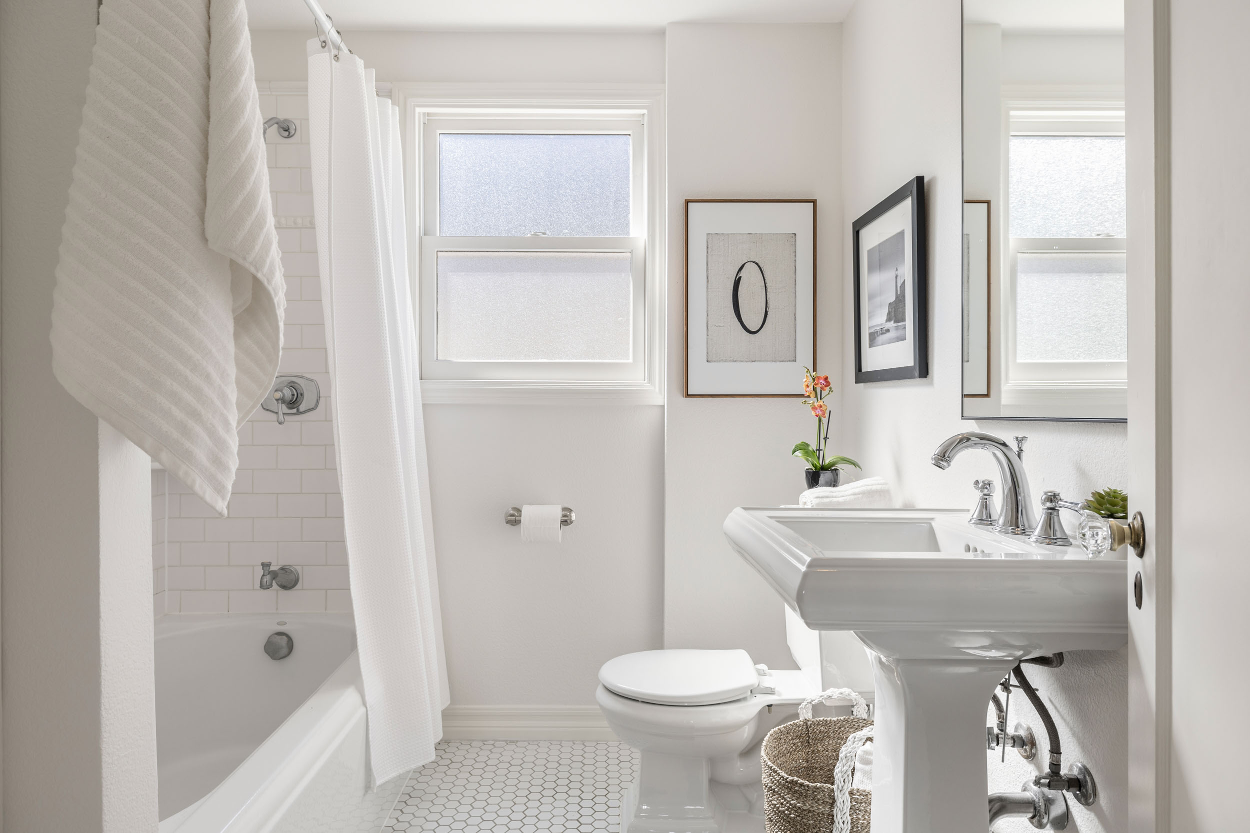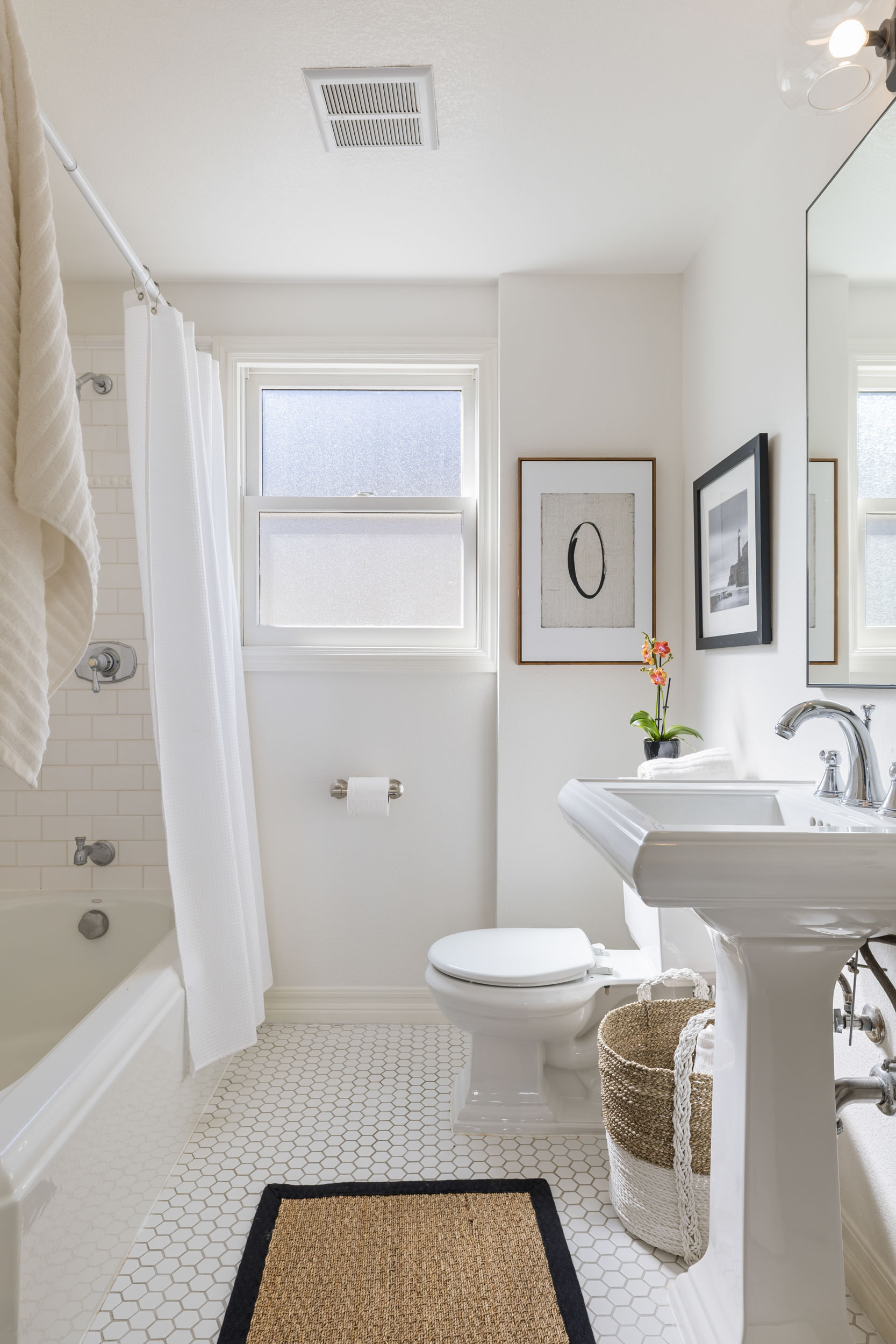 - Hall bathroom: traditional hex penny floor tile, shower over tub, pedestal sink with new modern sconce and mirror (2025)
