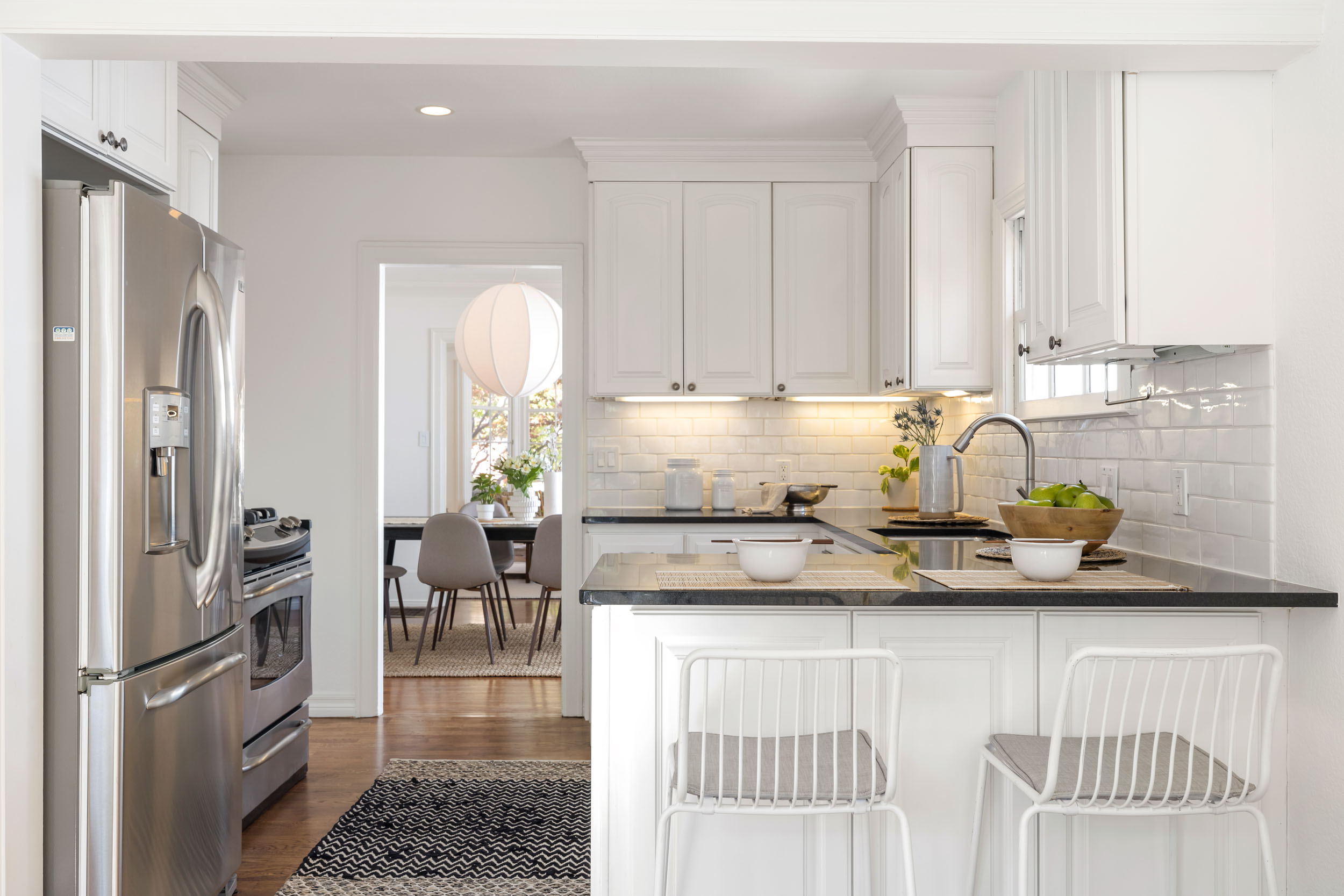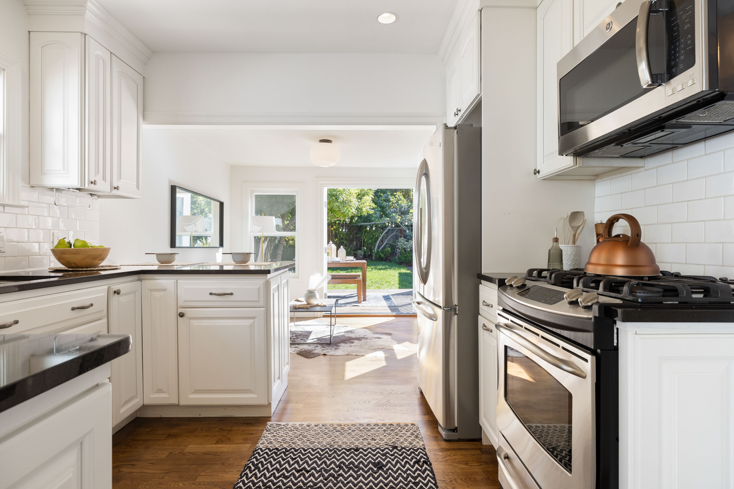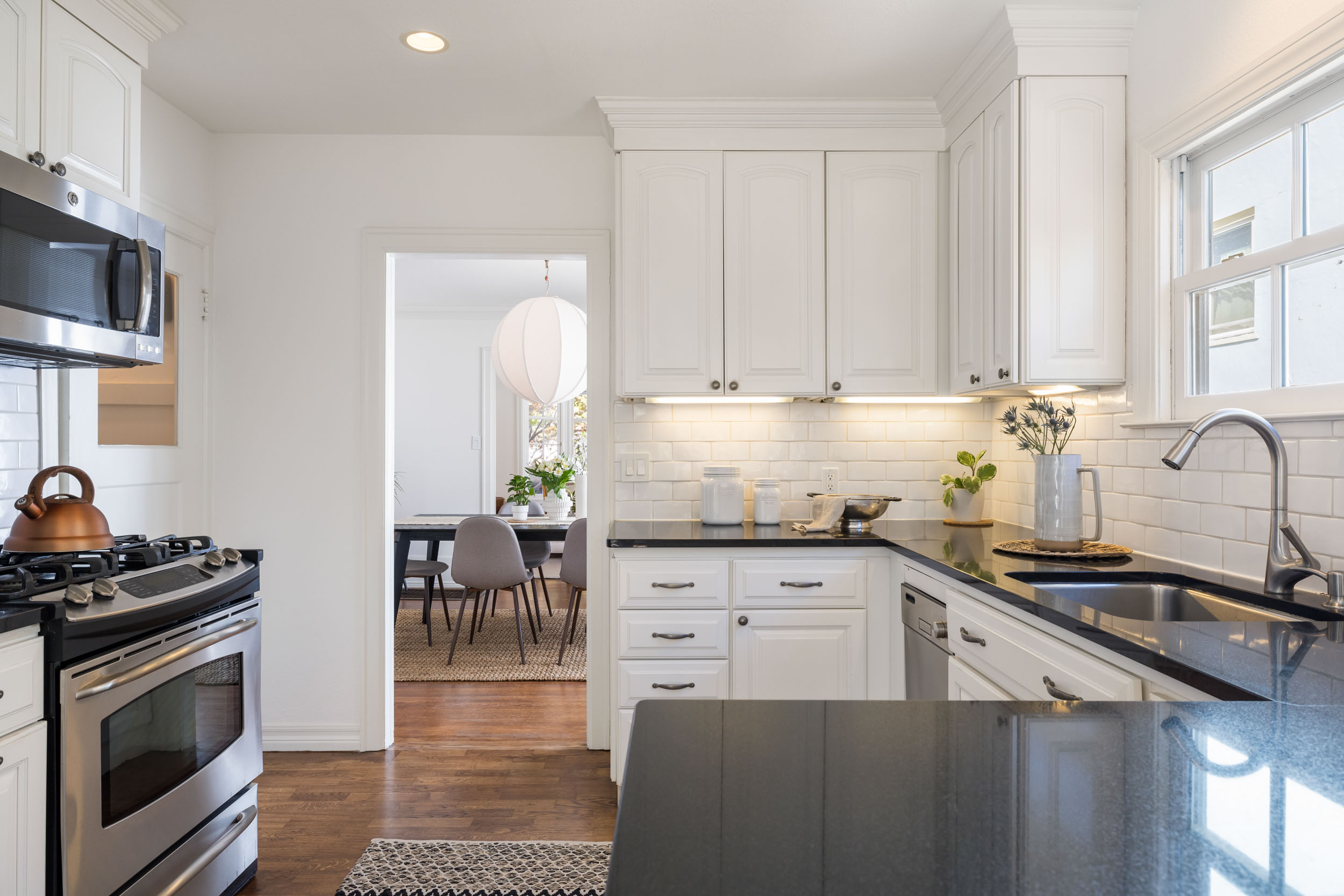 - Updated kitchen with shaker cabinets, classic black stone countertops, and subway tile backsplash