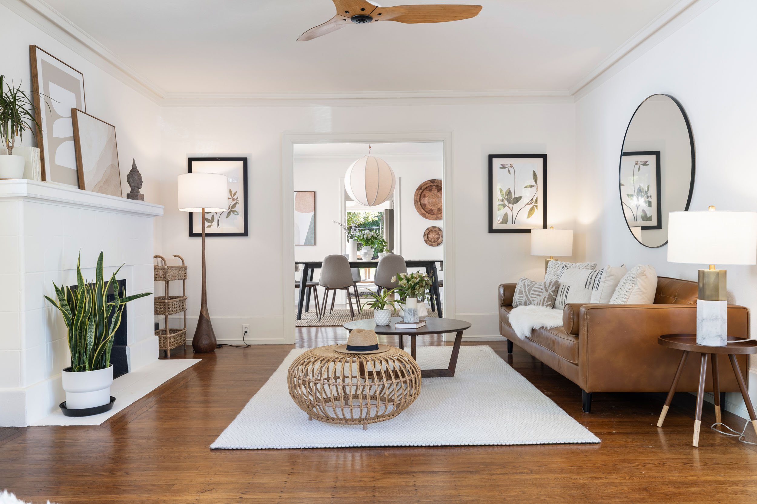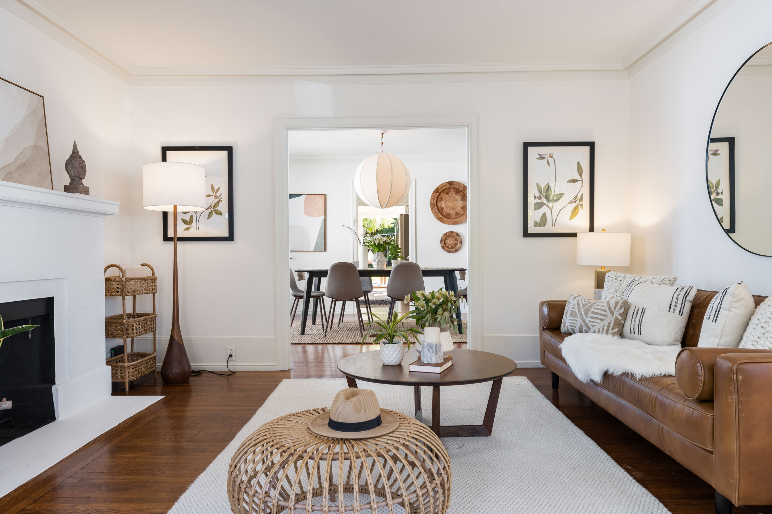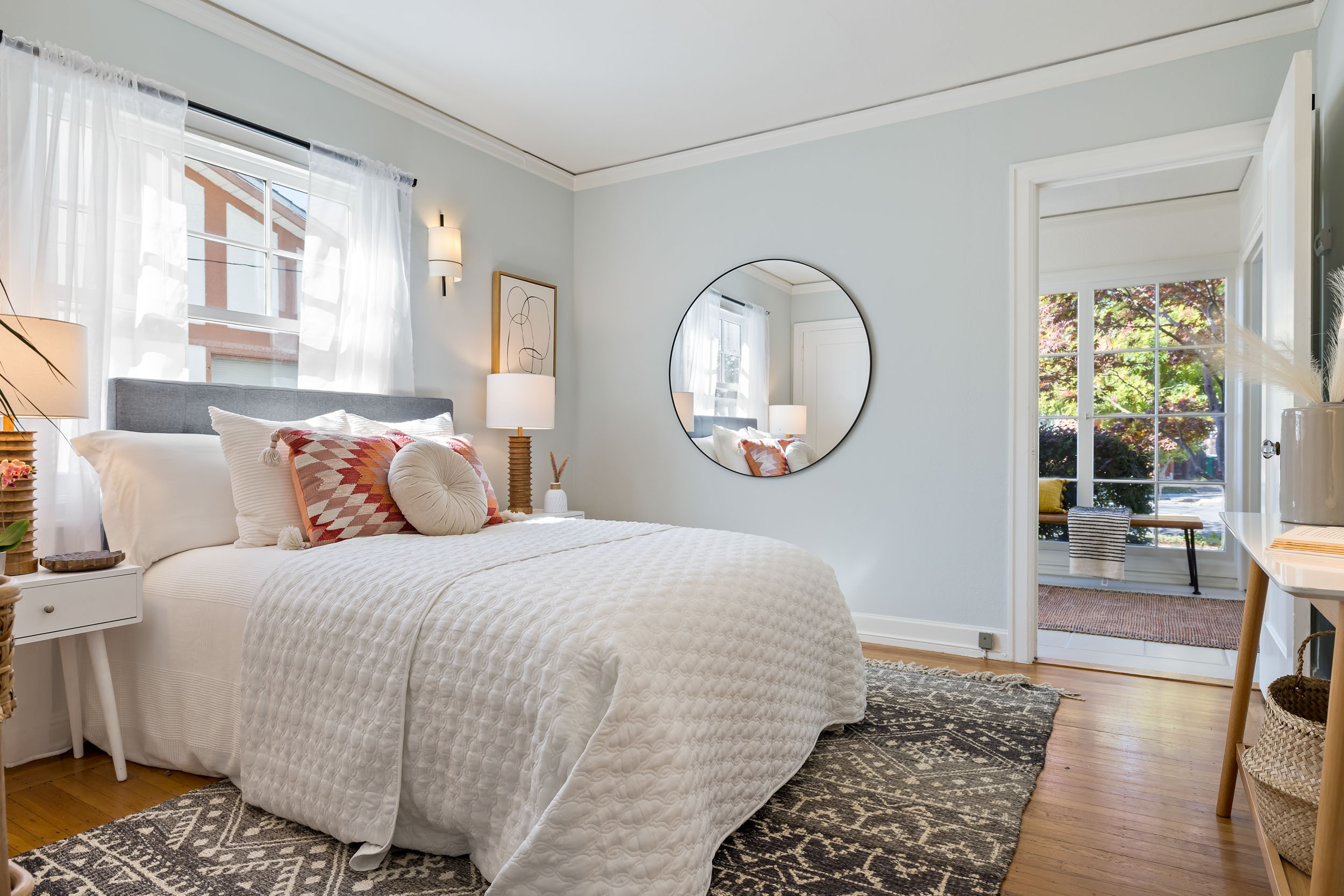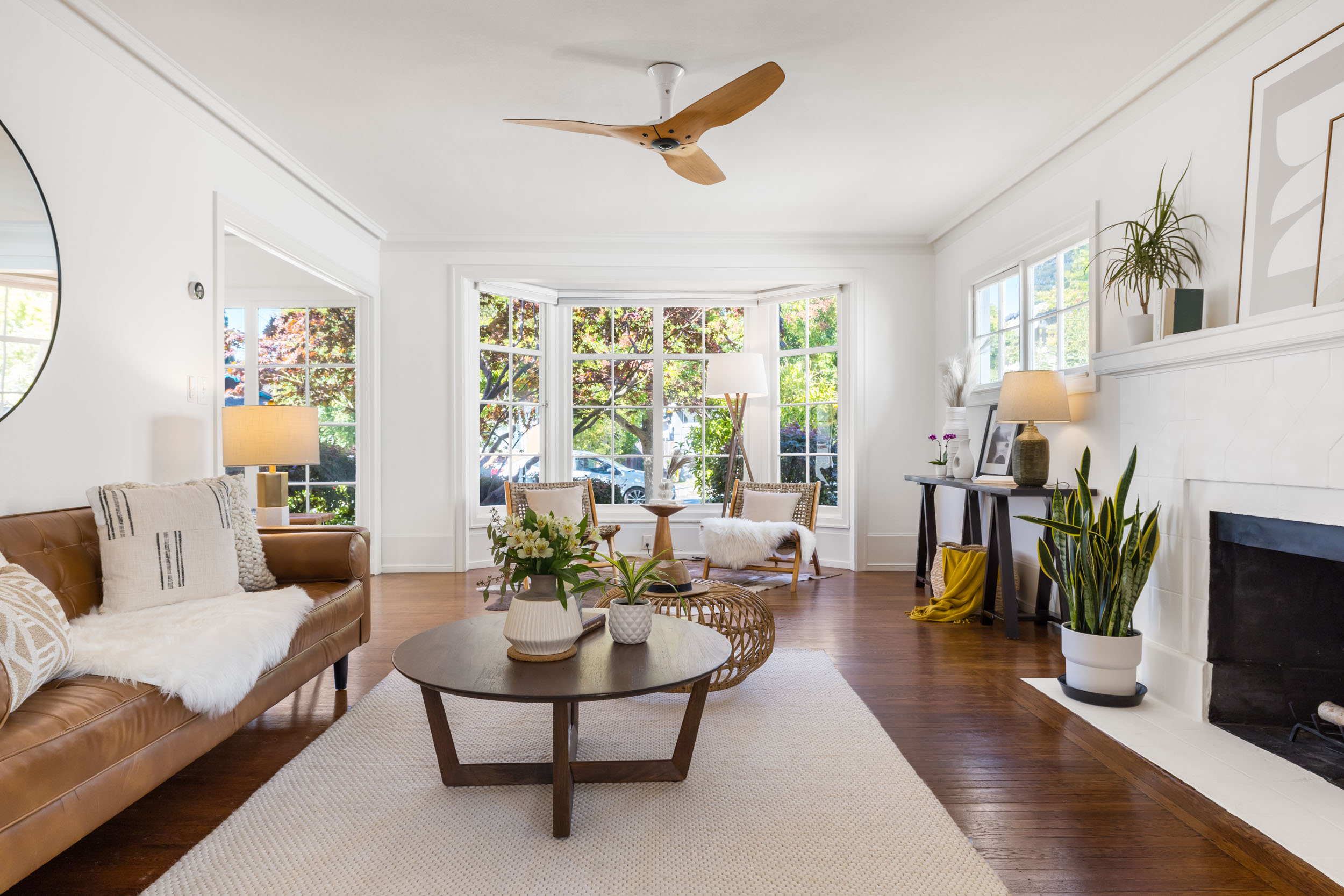 - The main level features a formal entry that leads you to a living room with fireplace and large bay window. Connected is a formal dining area with modern pendant light. The classic kitchen with a family room leads out via French doors to the deck and garden. Two generously sized bedrooms, the primary up a short flight of stairs with corner windows, share a charming hall bathroom. Upstairs is the third bedroom perfect as an office or guest room, with a daybed nook. The long driveway provides ample parking and leads to the large separate garage. In the rear of the garage, with its separate entrance, is the additional bonus room perfect as a skylit studio or home office.
