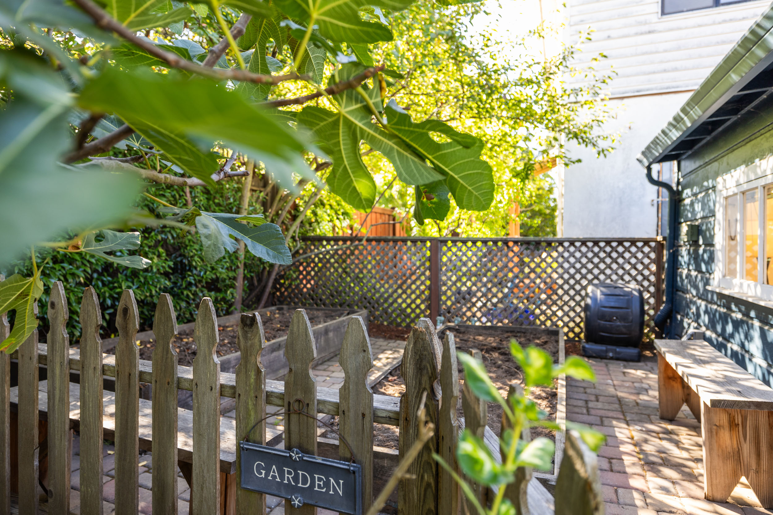 - The fully fenced garden includes a charming wooden deck and generous grassy lawn. Tucked behind the garage and fenced are raised garden planter beds.